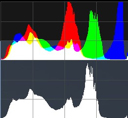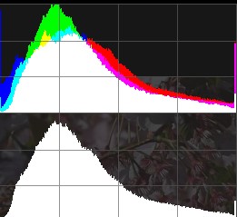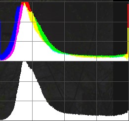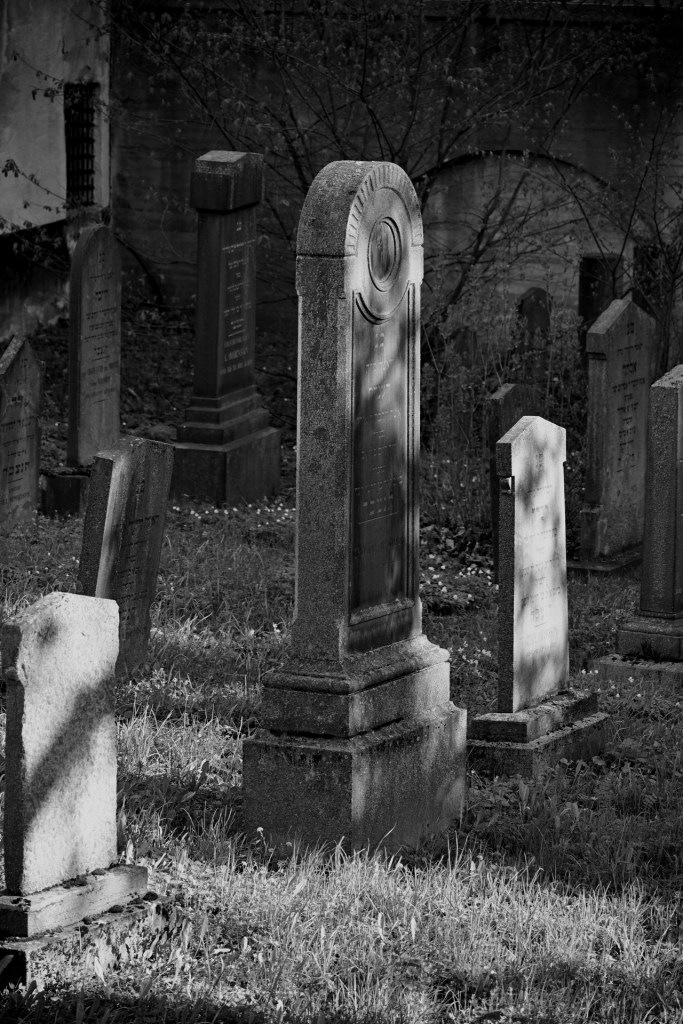 This is an image I really wanted to see as a monochrome image. The background is quite dark and two of the gravestones are in direct sunlight. As you can see in the histogram, the majority is in the darker third, but there is a slight overexposure visible