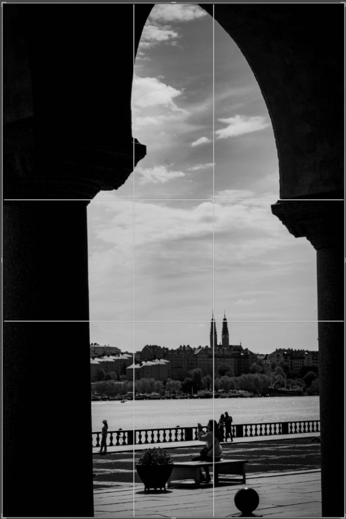 I end with this monochrome, framed picture. The spire is aligned with the photographing tourist. The line of the pillars in the arch align neatly around the guideline. I think the image would have been even better, if I could have gotten a slightly elevated position to get the delineation between sky and trees closer to the golden ratio. I tried on it on site, but that would have cut off the top of the framing arch. In hindsight, I should have taken both pictures and made a comparison later. That would have been interesting.